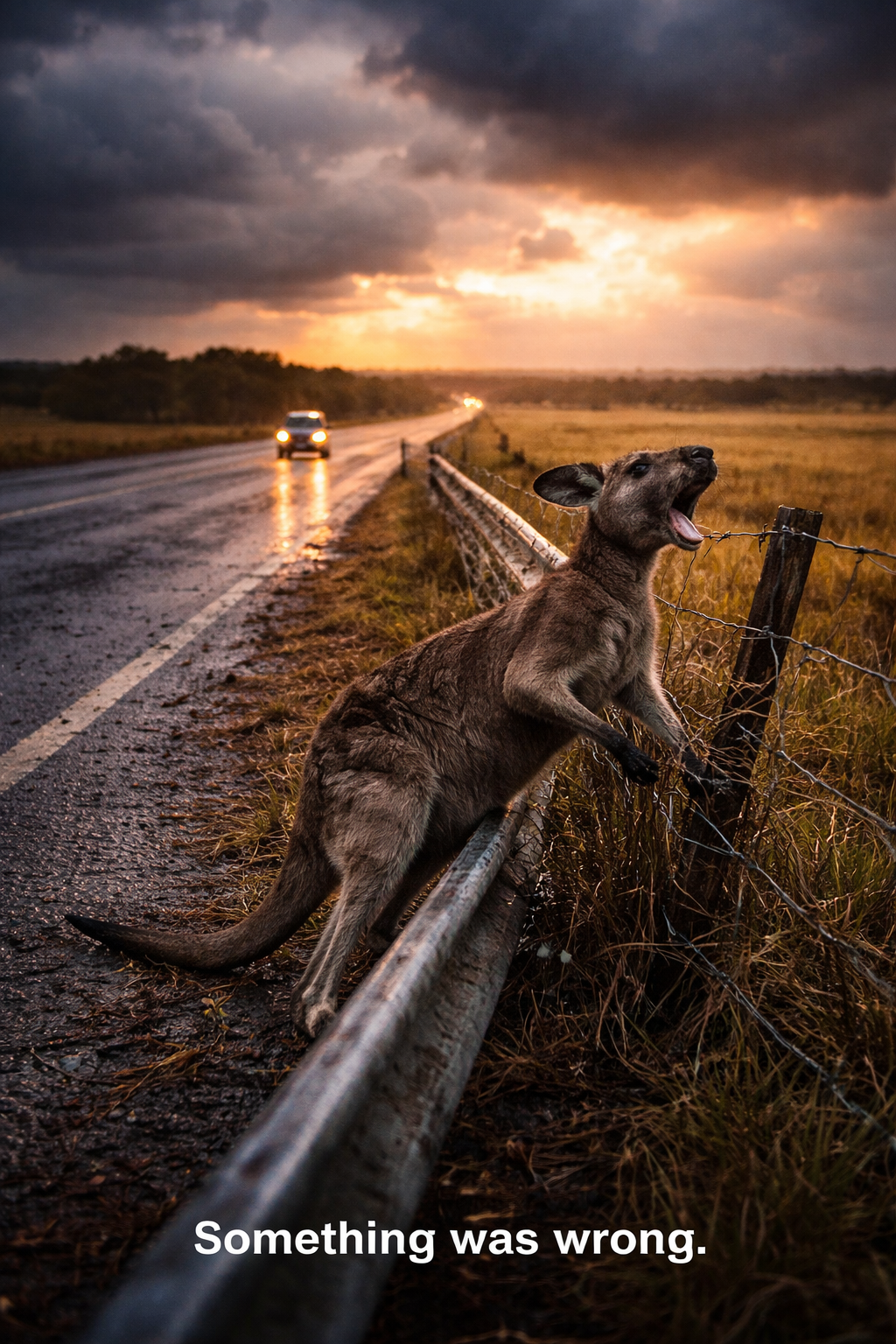 A kangaroo was tangled in a loose roadside wire fence near a metal guardrail. One leg caught tight. Every attempt to free itself only pulled the wire deeper.