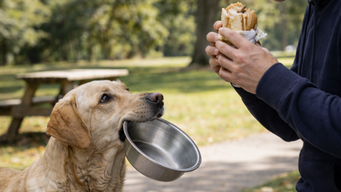 The dog watched carefully, still holding the bowl. No aggression. No desperation. Just hope.
