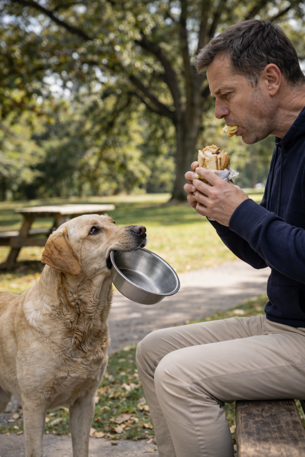 The dog stood directly in front of the bench, holding an empty metal bowl gently in its mouth. It didn't bark. It didn't jump. It simply looked up at the man with calm, patient eyes.