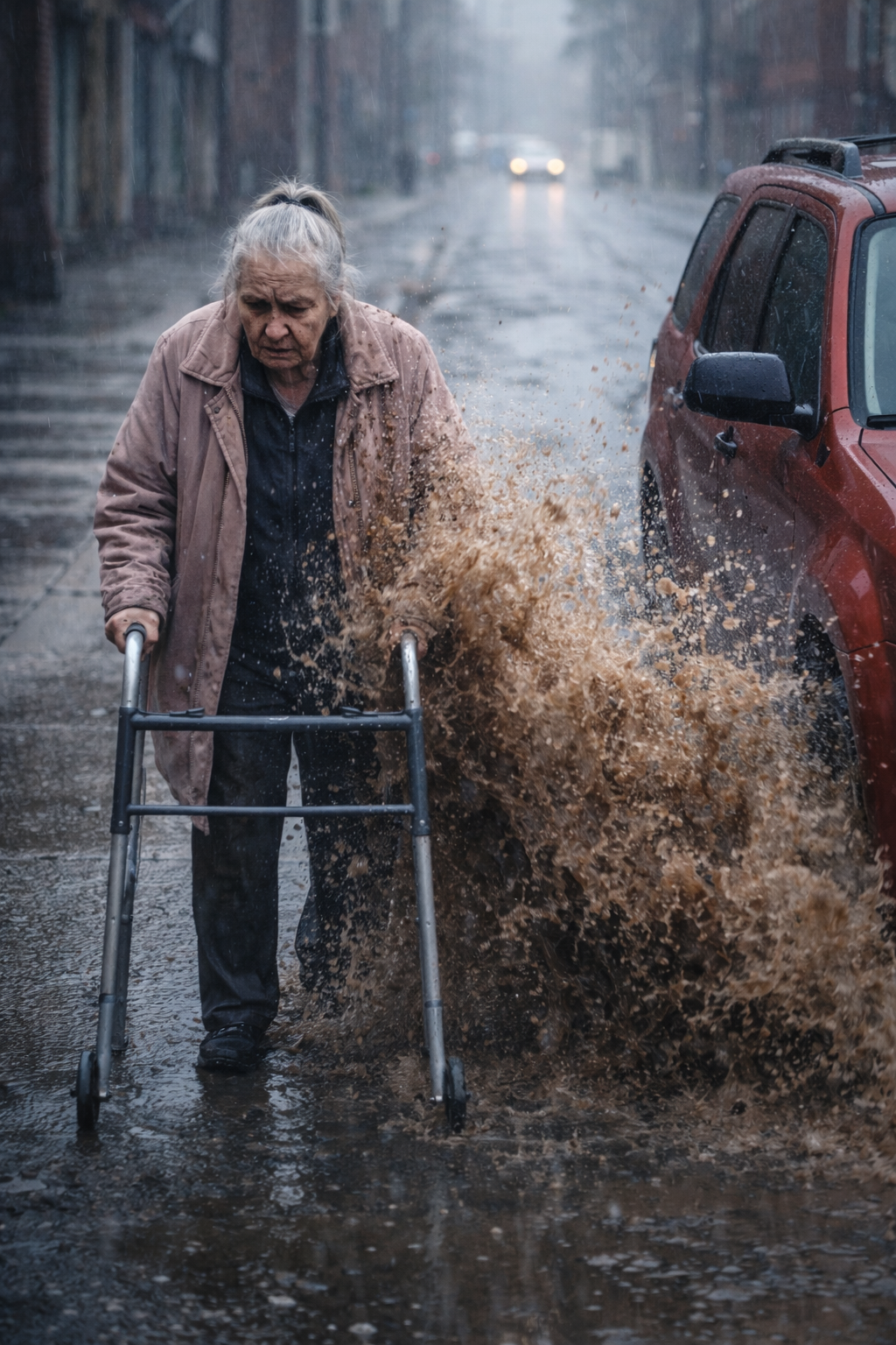 A red SUV came speeding down the street, way too fast for the weather. Instead of slowing near the sidewalk, the driver pressed the gas. The tires hit a deep puddle and exploded water outward.